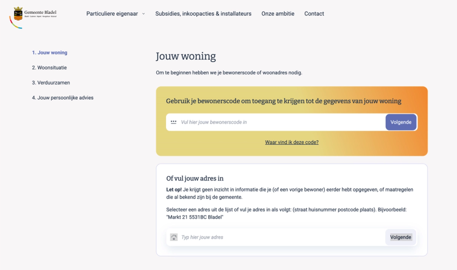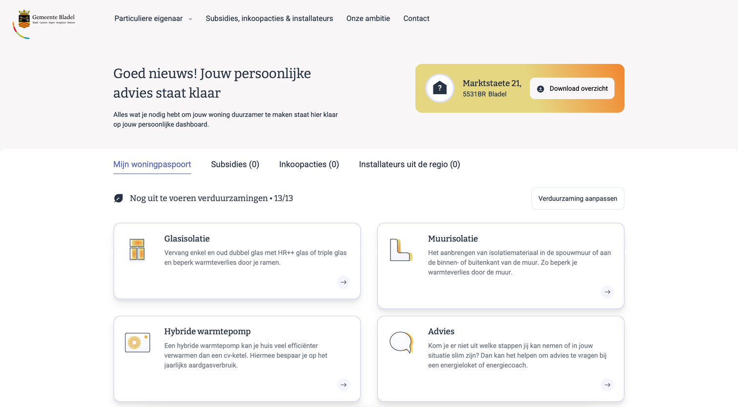 Inwoners ontvangen een unieke bewonerscode waarmee zij kunnen inloggen op het platform. Na het invullen van een korte vragenlijst over reeds genomen en gewenste verduurzamingsmaatregelen, genereert het platform een persoonlijk duurzaamheidsrapport. Dit rapport bevat: